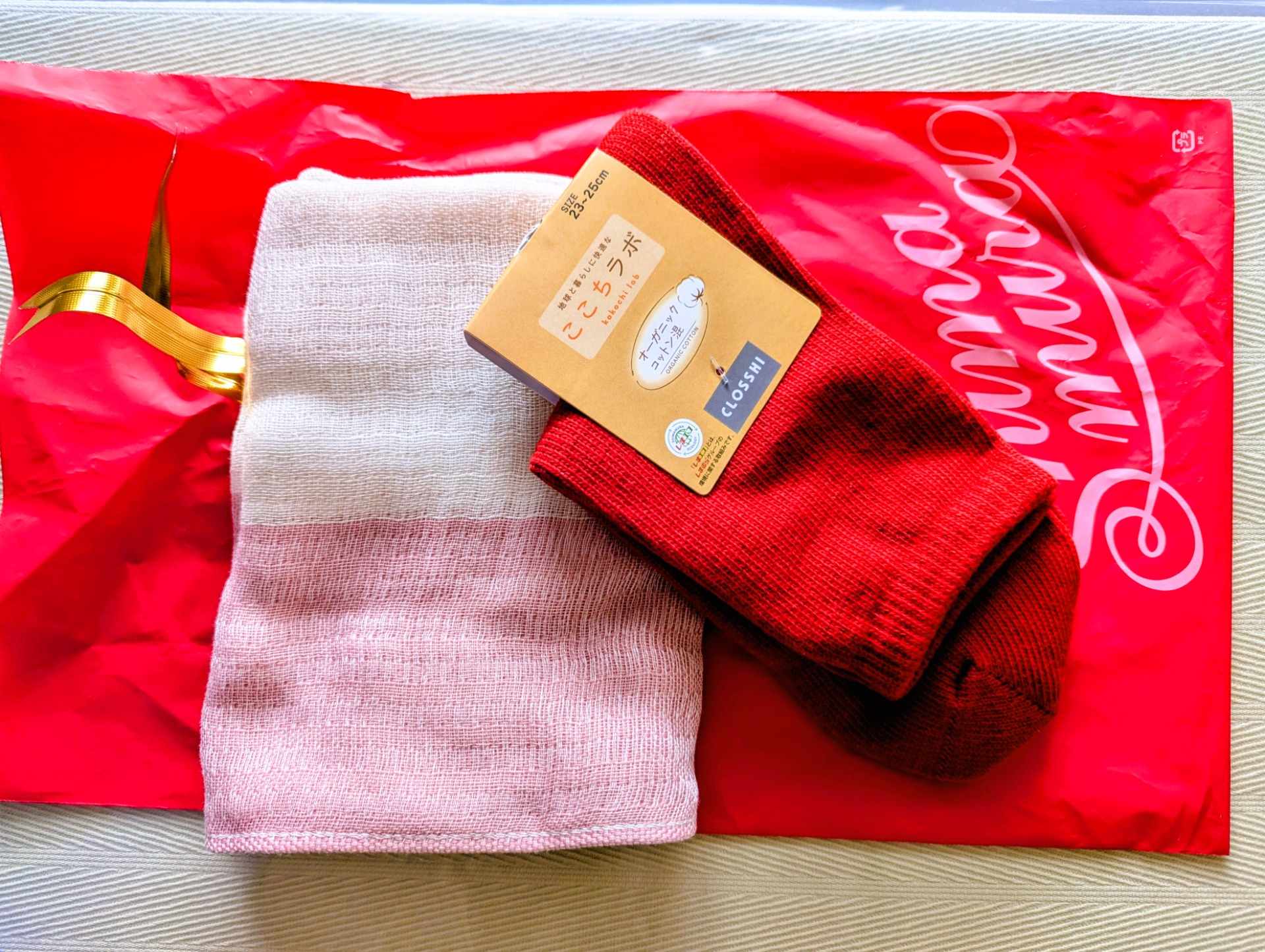 埼玉の美容師のお友達の所へ行った日の事です。事前に「赤いパンツ買ってあげようか?」とラインがきたので「買って買って~(笑)。」と返信したら、靴下とスカーフをくれました。