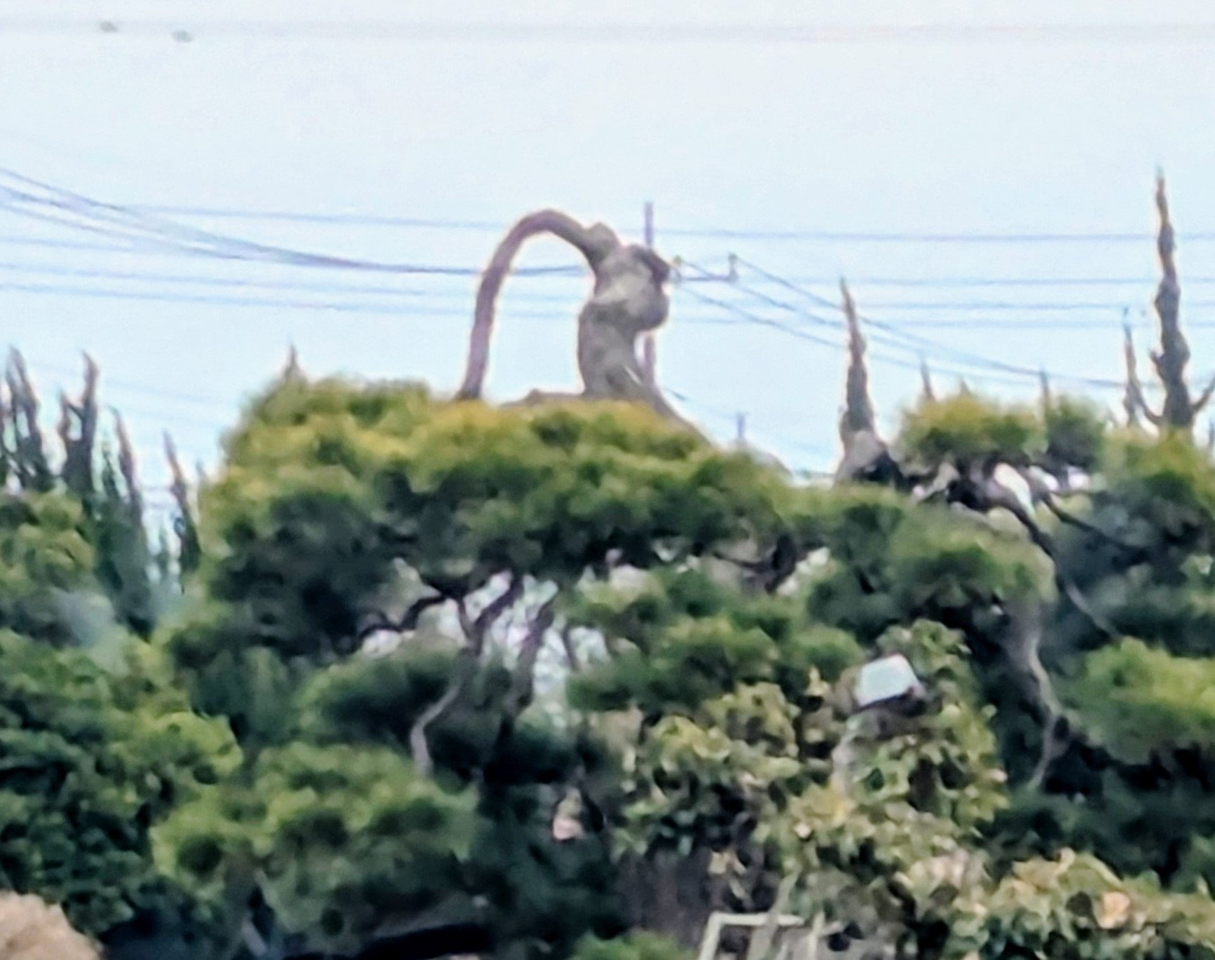友人宅の庭から見た、お向かいさんの植木。ボケてますが中央の枝がグニュ~っと曲がって下を向いているのがわかりますか?始めはオブジェかなと思ったのですが、レンズ越しにズームでみてもやっぱり本物っぽい。