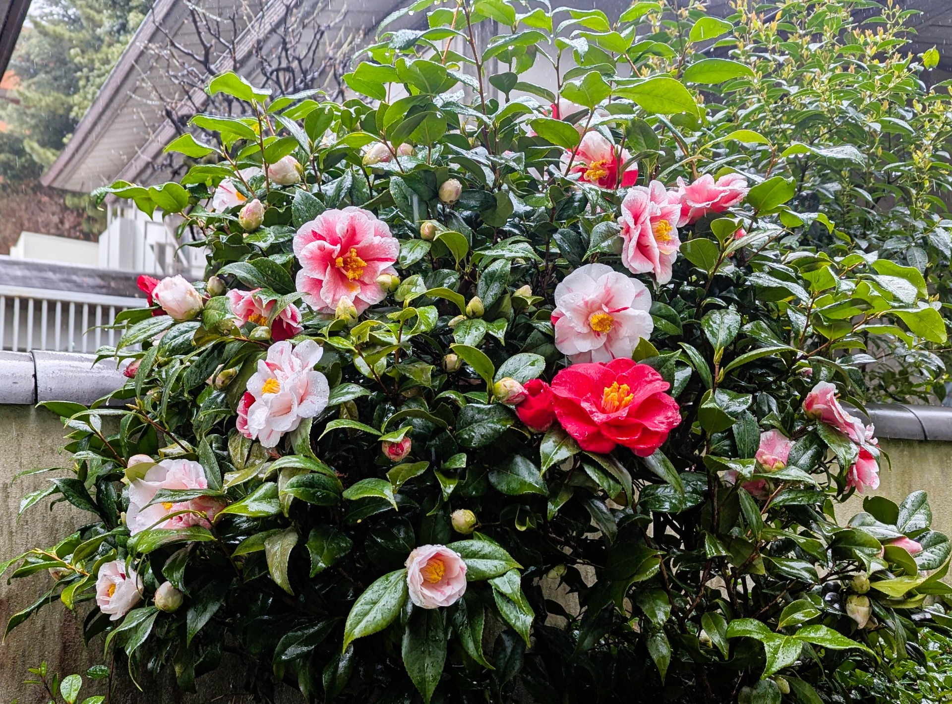 先日、東中野に行った時に出会った見事なツバキ。思わず足を止めてしまうくらいゴージャスでした。1つの木にこんな色々な顔を見せてくれるツバキがあるんですね。家にも何本もツバキがあり白やピンク、赤などいくつかの色がありますが、全て単色。1つの木に2色はありません。