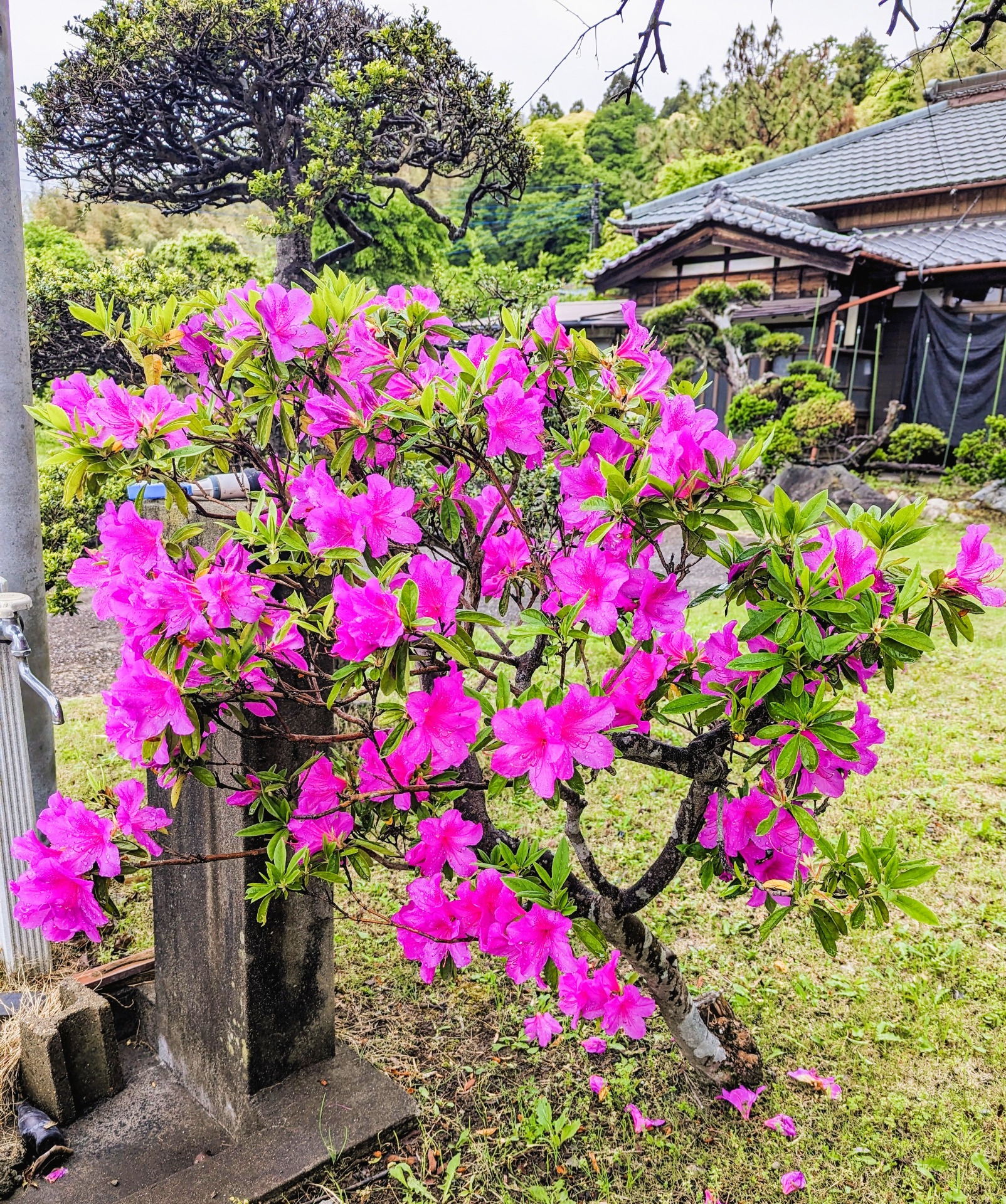 お店の入り口近くで咲いている、こちらは多分ツツジ。サツキとツツジはパッと見では見分けがつかない。オシベの数が違うとか、葉の色つやだとか、見比べてみないとよく分からないし、確認するまでの興味はなく・・・・💦今年もキレイに咲いたなぁくらいの印象。