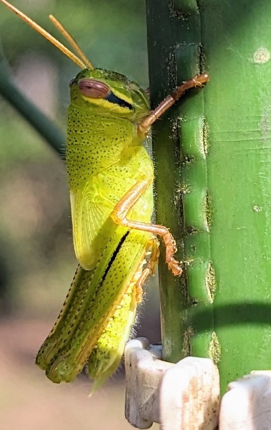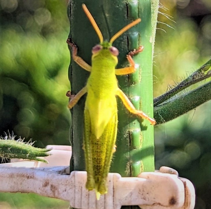 翌朝、抜け殻の事は忘れ、また水をやりにいき、最近芋虫の被害が多発していたのでその駆除をしていたら、脱皮後の本体?らしき昆虫がいたので、また写真を撮りました。横からも撮ってみたのですが脱皮と同一、ですよね?バッタだと思うのですが、触覚まできれいに残して脱皮出来るなんて凄すぎます( ゚Д゚)