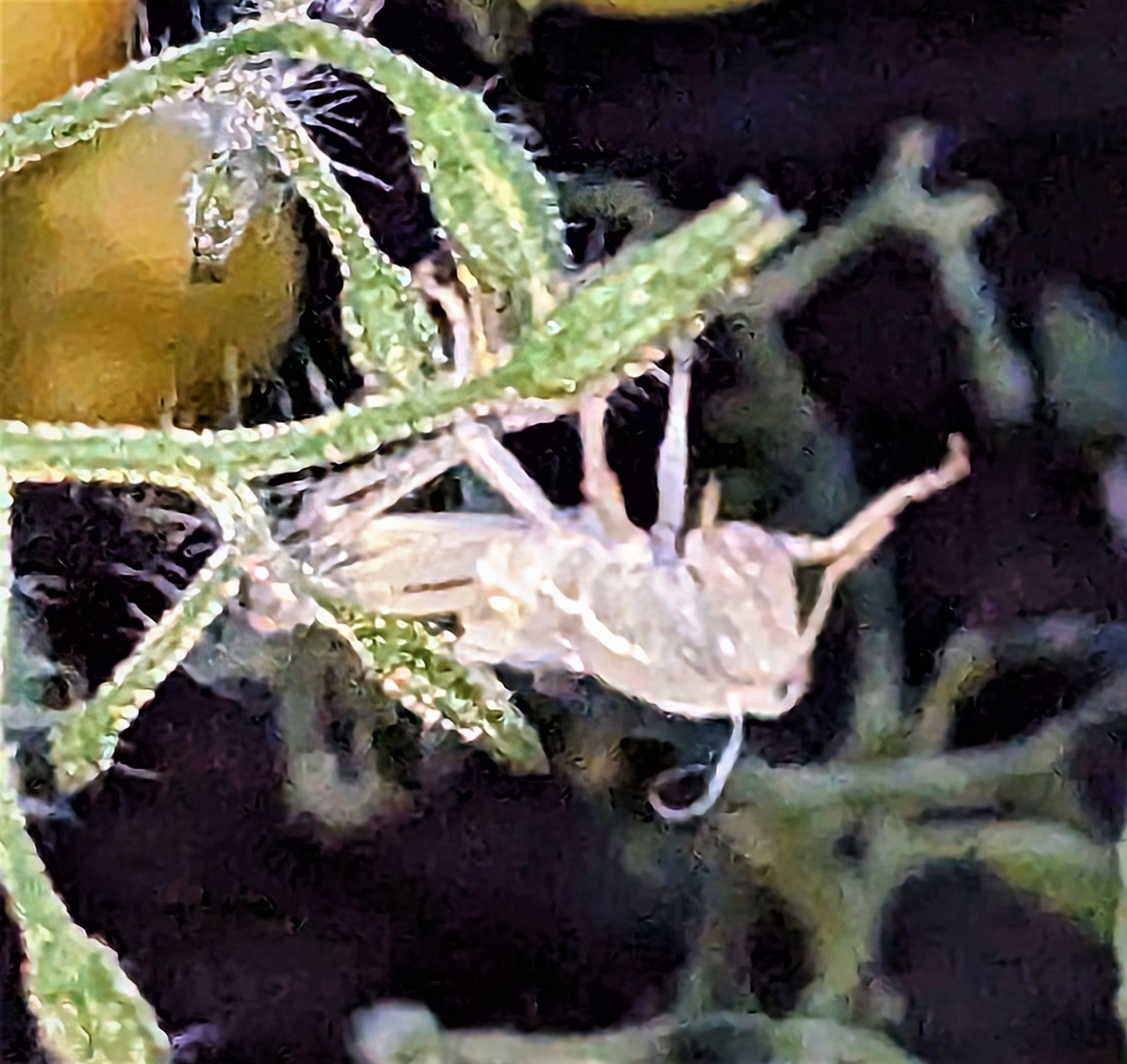 トマトに水をあげようとしていたら、白くて透明っぽいものが見えたので、珍しい昆虫発見!と思ったのですが、よ~く見たら脱皮後の抜け殻みたいです。いずれにしても珍しいので写真を撮ったのですが、夕方で日が落ちかけていたので、写真を撮っただけ。