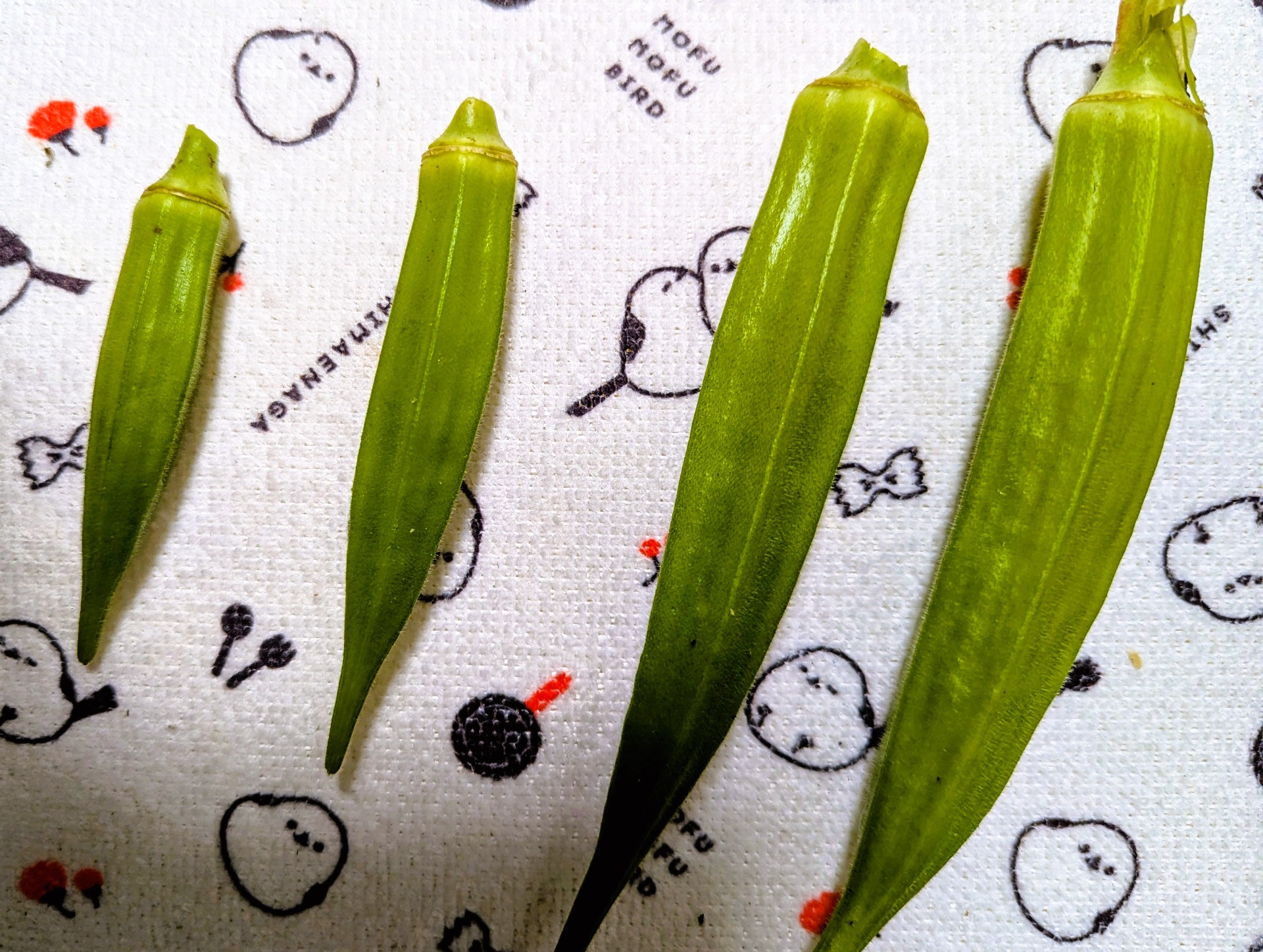 毎日のように見ているつもりでも、見ていないんですねぇ・・。またオクラが巨大化しておりました⤵左から2番目がスーパーでよく見かけるサイズなので、右の2本は硬すぎてもう食べられません(´;ω;`)