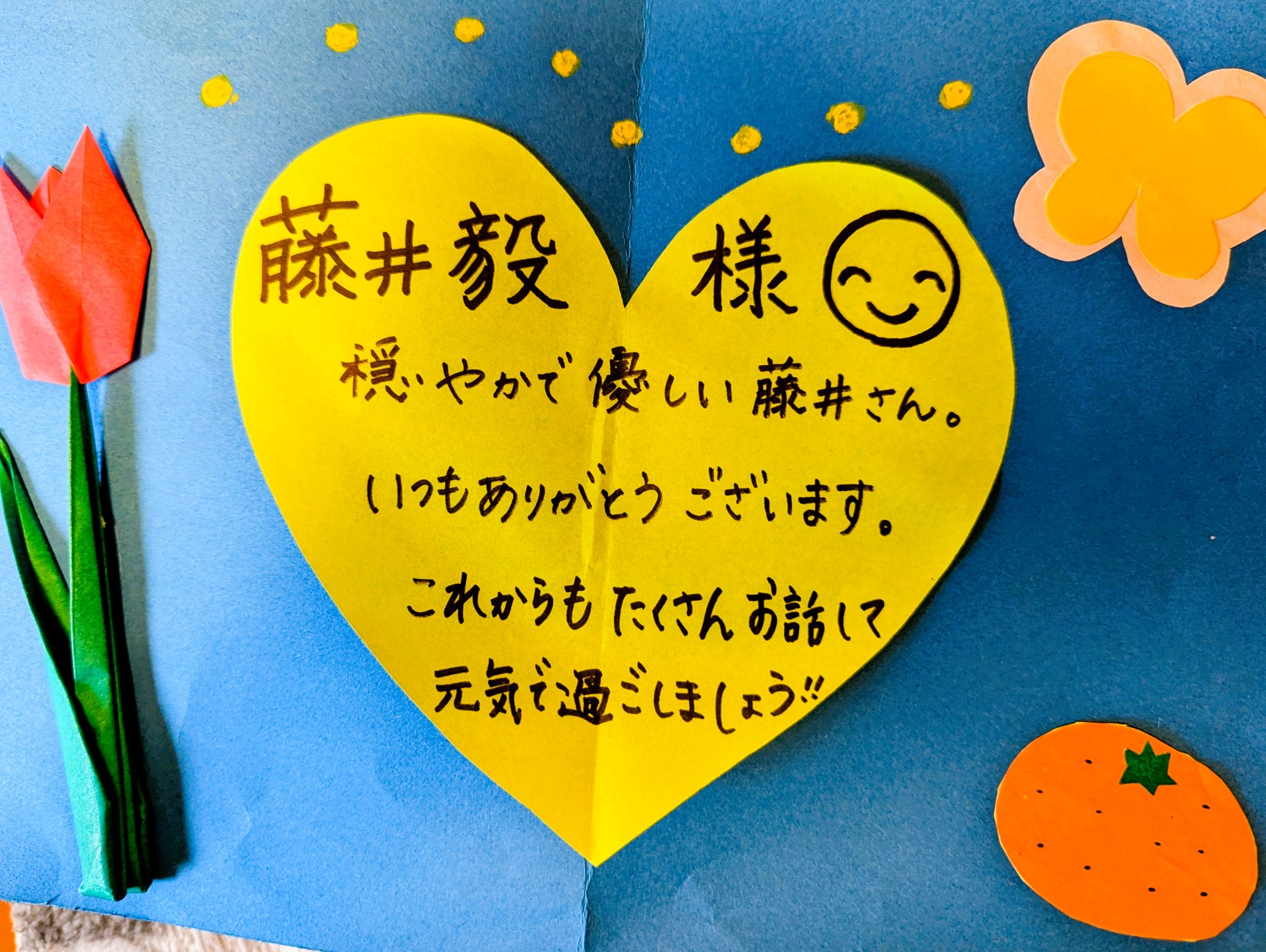 先月の話ですが、敬老の日に向けて施設の職員の方々が、利用者一人ひとりにこうして手書きの感謝状をくださいました。以前SNSの動画でも感謝状をもらったことをお伝えさせていただきましたが、それとは別にこちらもいただいたのです。