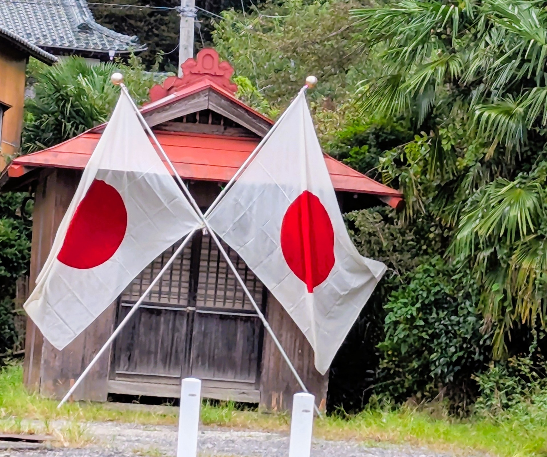 子供の頃はそれぞれの家の玄関でも国旗を立てていた記憶がうっすら残っています。いつの頃からかやらなくなっていたので、すっかり忘れていましたがこの倉の前では今でもやっているんだ、と何十年ぶりかで知りました。