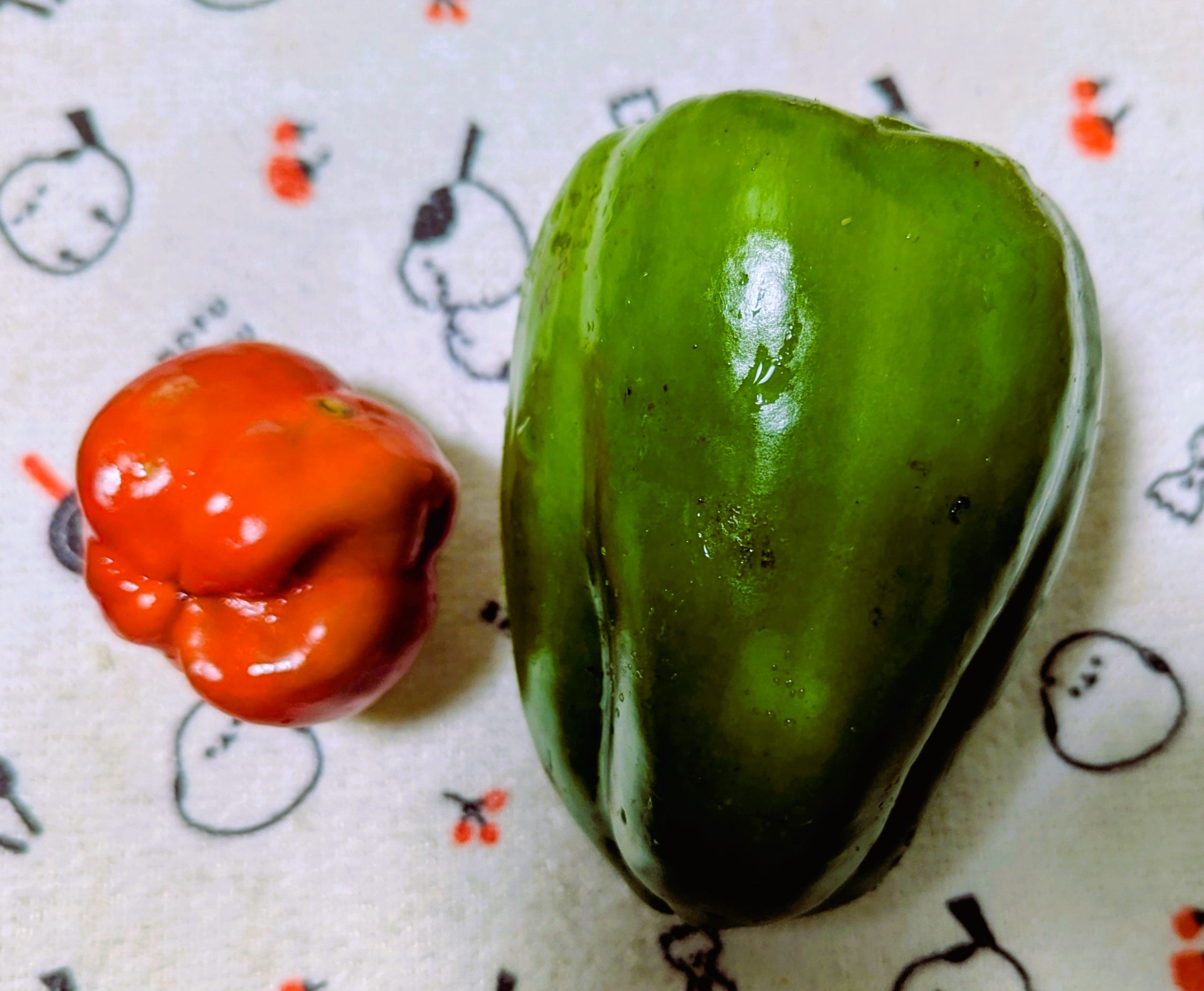 もう一方は大きくなってくれたけどいつになっても赤くなってくれないので、食べられなくなる前に収穫することに。緑の方はスーパーでかなり大きいパプリカが売られているときがありますが、まさにその大きさ!食べられなくなる前に収穫といたしました。来年をまた楽しみにしてますよぅ😊