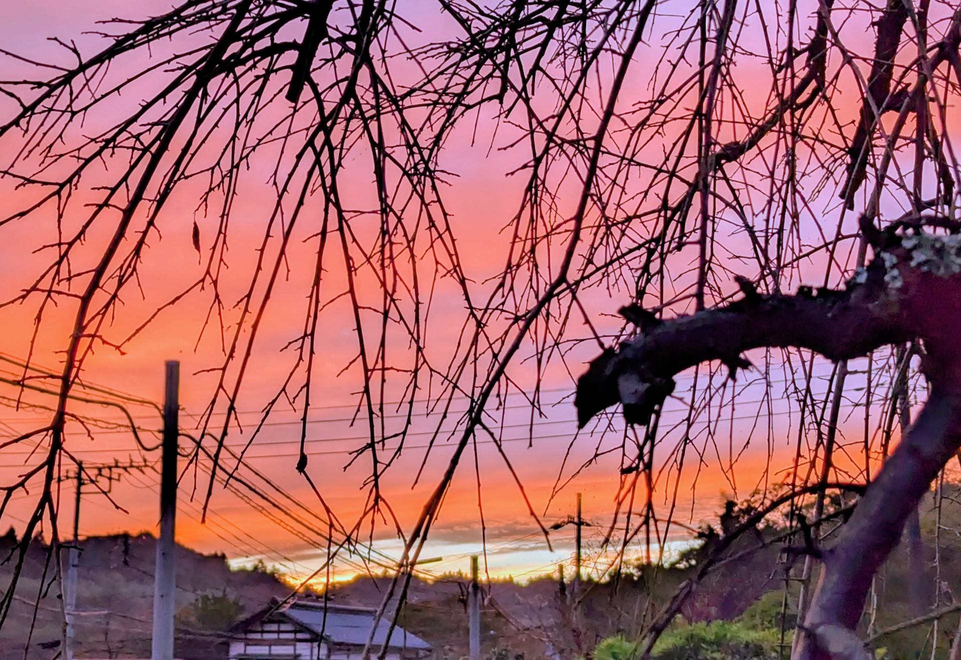 お店の横にある梅の木越しの夕焼けです。いつものことですが、自然をそのまま写すのってほんとに難しいですねぇ。何枚か撮ったんですけど似たり寄ったりで⤵
